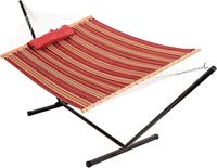 450LBS Capacity 12ft Red Stripe Quilted Double Hammock with Stand for Garden, Backyard, Pool, Beach and Outdoor